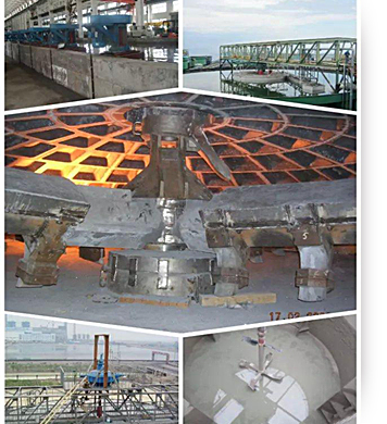 沉淀池刮泥機我公司根據現場的工況要求設計了在扭矩過大時攪拌軸和攪拌耙壁自動提升裝置,當扭矩下降后再自動下降刮泥的功能以防止不穩定的工況下攪拌軸和刮泥耙壁的損壞。主要有扭矩和功能電氣控制系統、傳動減速機系統、回轉支撐系統、自動提升系統、攪拌耙壁系統等組成。轉速從0.07-0.2rpm,池體直徑?3-25m,扭矩3000-50000N.m,可以長期無后顧之憂的使用。